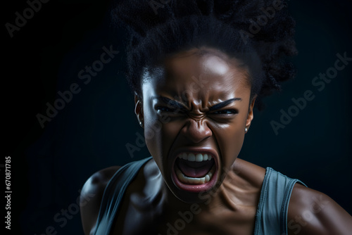 © lucky pics, Fototapeta premium Angry young adult African American woman yelling, head and shoulders portrait on black background. Neural network generated image. Not based on any actual person or scene.