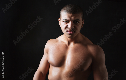 © Drobot Dean, Fototapeta premium Angry young african sportsman standing over black background