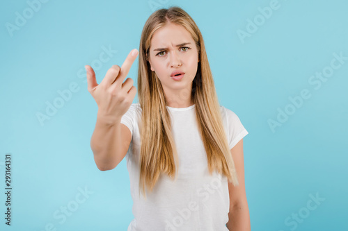 © Anastasia, Fototapeta premium angry young woman showing middle finger isolated over blue