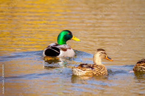 © Vadim Hnidash, Obraz premium animal a wild drake and a duck sail on a pond