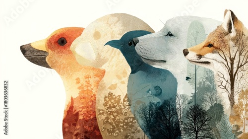 © Wasun, Naklejka premium Animal collage with bird, raven, polar bear, and fox profiles layered with forest silhouettes, creating harmonious wildlife and nature connection in warm and cool tones