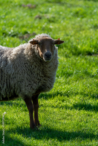 © barmalini, Fototapeta premium Animal collection, young and old sheeps grazing on green meadows on Haspengouw, Belgium