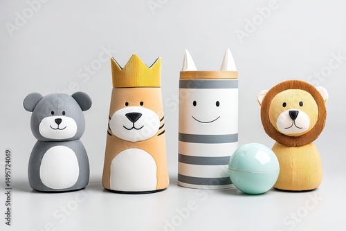 Obraz premium Animal Figurines and a Cosmetic Ball on a White Background