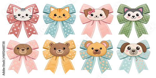 Naklejka premium Animal Gift Ribbons PNG Set – Cute Bows with Cats, Dogs, Teddy Bears,...