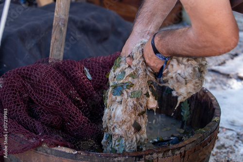 © Mauro Rodrigues, Obraz premium Animal hide being washed