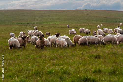 Fototapeta premium Animal husbandry. A large flock of sheep on a mountain pasture. Fagaras...