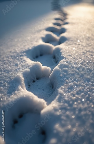 © Vadym, Obraz premium Animal paw prints march across a sunlit snow field. Crisp winter tracks create a clear path, highlighting cold white ground and sparkling ice crystals. Shadows lengthen as daylight fades.