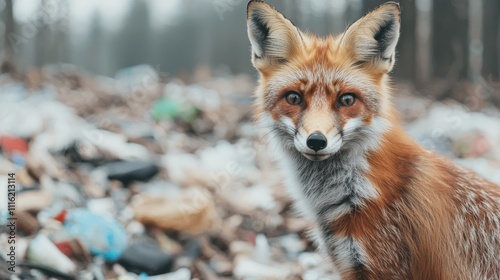 Fototapeta premium Animal pollution microplastics. Fox in a polluted environment with litter in the background.