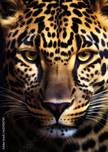 © gnpackz, Naklejka premium Animal portrait of a wild leopard on a black background conceptual for frame