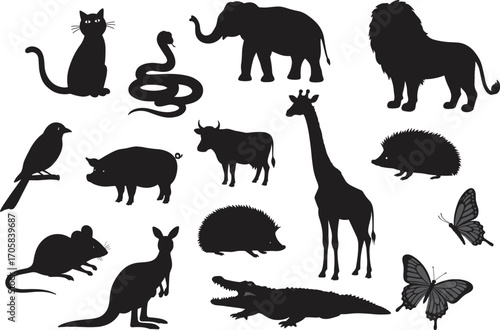 Fototapeta premium Animal silhouettes vector set including wild and domestic animals, cat, lion, elephant, giraffe, snake, birds, butterfly, crocodile