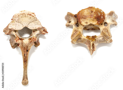 © Илья Подопригоров, Naklejka premium Animal vertebrae bones isolated on white background. leftover food closeup