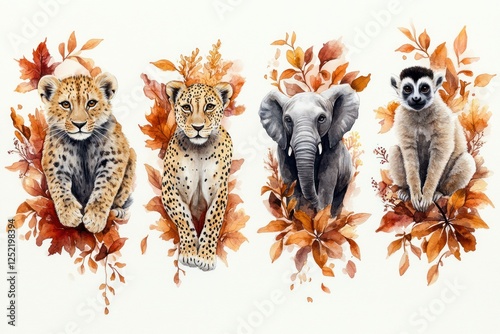 © Aleksandra, Obraz premium Animal watercolor illustration with lion lioness leopard monkey lemur elephant among autumn leaves tropical foliage