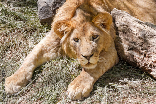 © Vadim Hnidash, Naklejka premium animal young lion lying on the grass