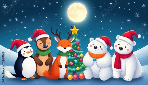 Fototapeta premium Animals celebrate Christmas Eve. white bear, penguin, deer, raccoon