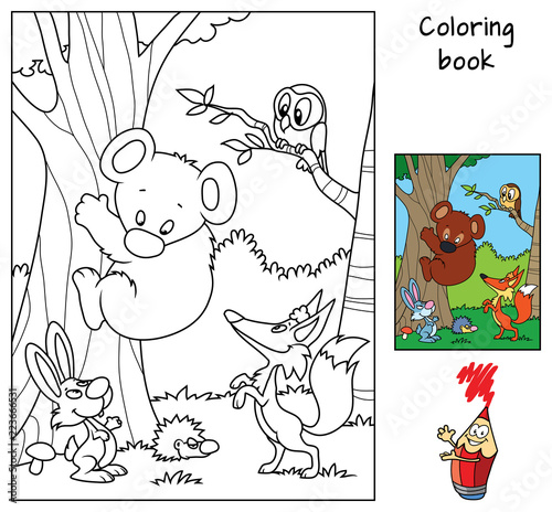 © Leh, Obraz premium Animals in the forest. Teddy bear, fox, hare, hedgehog and owl. Coloring book. Cartoon vector illustration