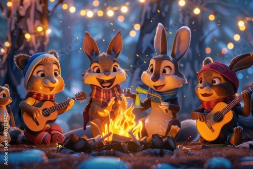 © nik_yurginson, Obraz premium Animated Animals Sing Around Campfire