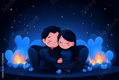 © SEH, Obraz premium Animated couple embracing near a glowing campfire with starry background