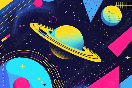 Fototapeta premium Animated flat space background with planets, stars, and abstract geometric shapes. Cosmic universe scene for science fiction and exploration.