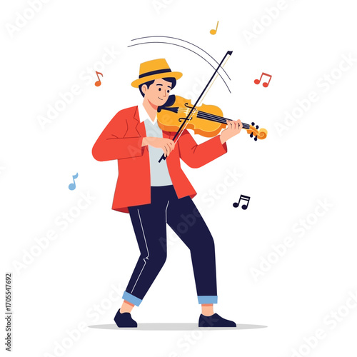 Obraz premium Animated Illustration of a Young Man Playing the Violin with Musical Notes