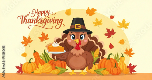 © Enska , Obraz premium Animated Thanksgiving Illustration: Turkey, Pumpkin Pie, and Corn in Autumn.