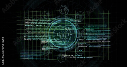© vectorfusionart, Naklejka premium Animating central circular HUD pulsing with layered rings on green grid UI, with code, nodes, icons