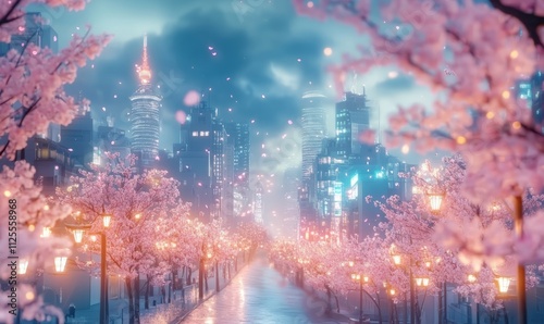 Obraz premium anime background with vibrant city lights, cherry blossoms, and pastel skies...