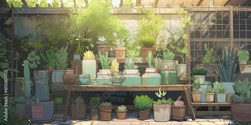 Fototapeta premium anime cartoon green garden growing plants, generated ai, generated, ai