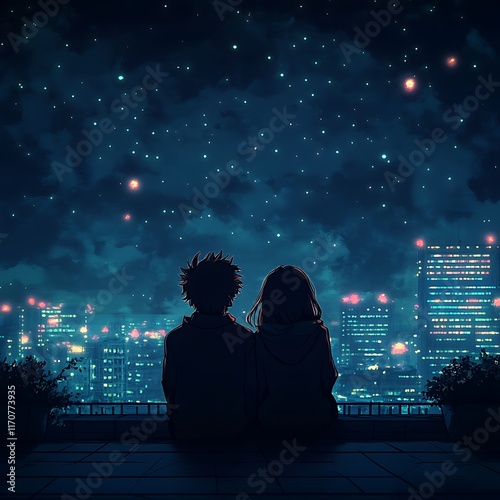 © ShadowHero, Fototapeta premium anime couple sitting on rooftop gazing at city lights