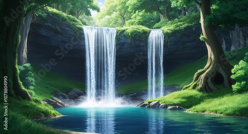 © Arceli, Fototapeta premium Anime forest waterfall cascading water serene vibes lush greenery