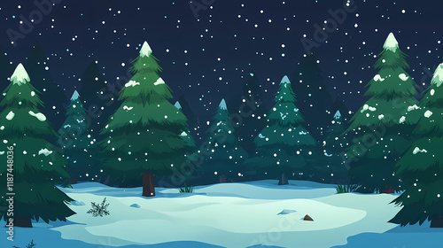 Naklejka premium Anime game art background, ambient christmas pine tree forest with snowfall....