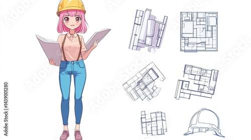 Fototapeta premium Anime girl architect reviewing blueprints.