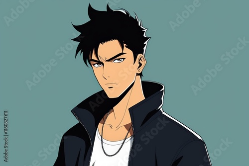 © haiqiang, Fototapeta premium anime guy with black hair and white shirt and black jacket