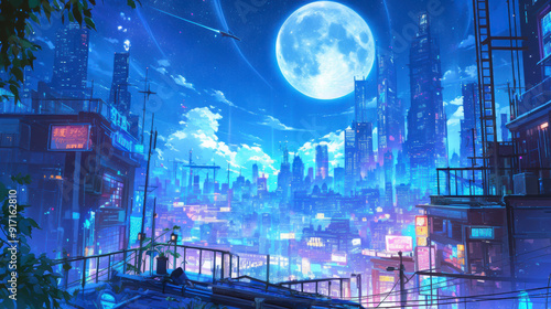 Obraz premium Anime illustration of Futuristic cityscape at night with a large full moon,...