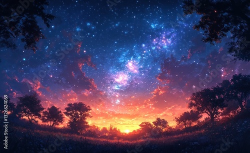 Fototapeta premium Anime Night Landscape with Glowing Galaxy and Tranquil Forest