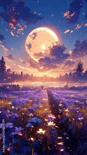 Naklejka premium anime purple flower field landscape moon sunset cloud y2k