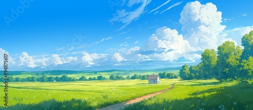 Obraz premium Anime-Style Green Field with Hill, Small House, Dirt Road, and Farm under a...