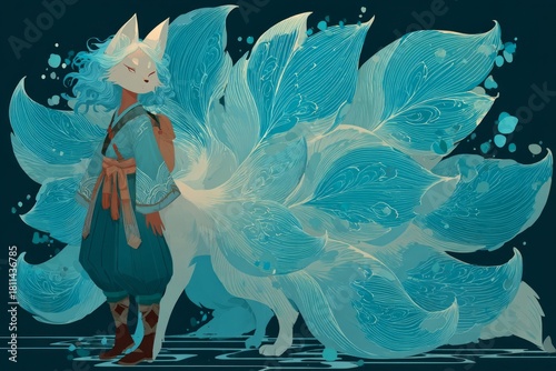 Obraz premium Anime style illustration featuring a mythological shapeshifter with a mask and flowing blue tails