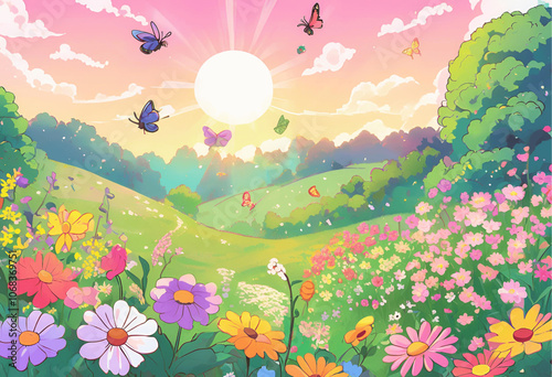 Fototapeta premium Anime-Style Meadow in Bloom
