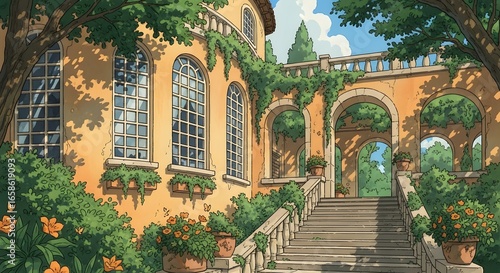 © Mellow Milkshake, Fototapeta premium Anime Style Mediterranean Villa with Grand Staircase and Lush Garden