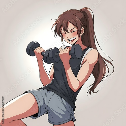 © Rocky, Obraz premium Anime woman with ponytail lifting dumbbells with determination