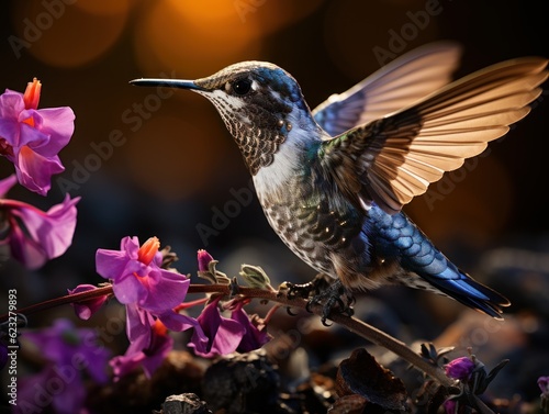 © Dushan, Fototapeta premium Anna's Hummingbird in flight with purple flower