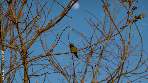 Fototapeta premium Anna's Hummingbird perches on a bare winter branch beneath a faint daytime moon