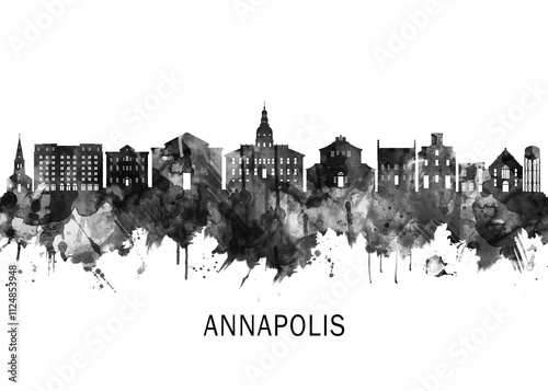 © Towseef Dar, Fototapeta premium Annapolis Maryland Skyline BW, abstract painting travel poster urban landscape modern art downtown skyline illustration landmarks skyscrapers artwork architecture
