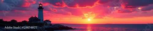 © Phascharaporn, Obraz premium Annisquam Lighthouse silhouetted against vibrant sunset sky, waves, scenic