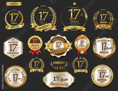 © totallyout, Obraz premium Anniversary golden laurel wreath and badges 17 years vector collection