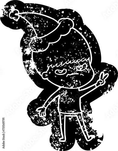 Fototapeta premium annoyed cartoon distressed icon of a boy wearing santa hat