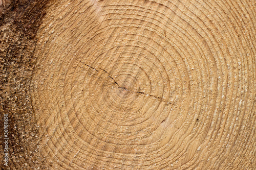 Naklejka premium Annual rings of sawn wood. Cross section of log. Natural background.