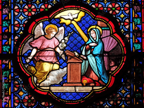 Fototapeta premium Annunciation of Mary, stained glass window in the Basilica of Saint Clotilde...