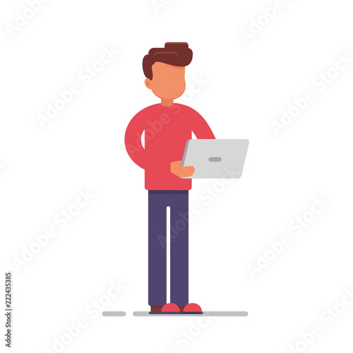 © Mary Long, Obraz premium anonymous employee with laptop computer sending email or working online. vector illustration isolated on white background.