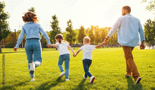 © JenkoAtaman, Fototapeta premium Anonymous happy family running back in park in summer evening.